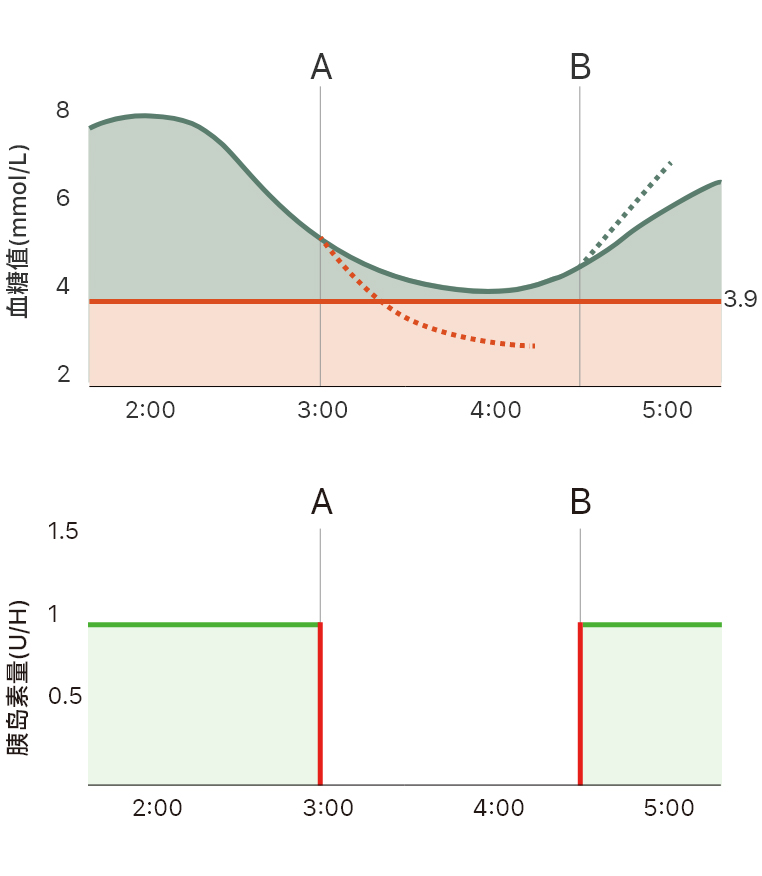 A点:预测血糖在设定的时间段内接近下限时,自动暂停胰岛素的输注